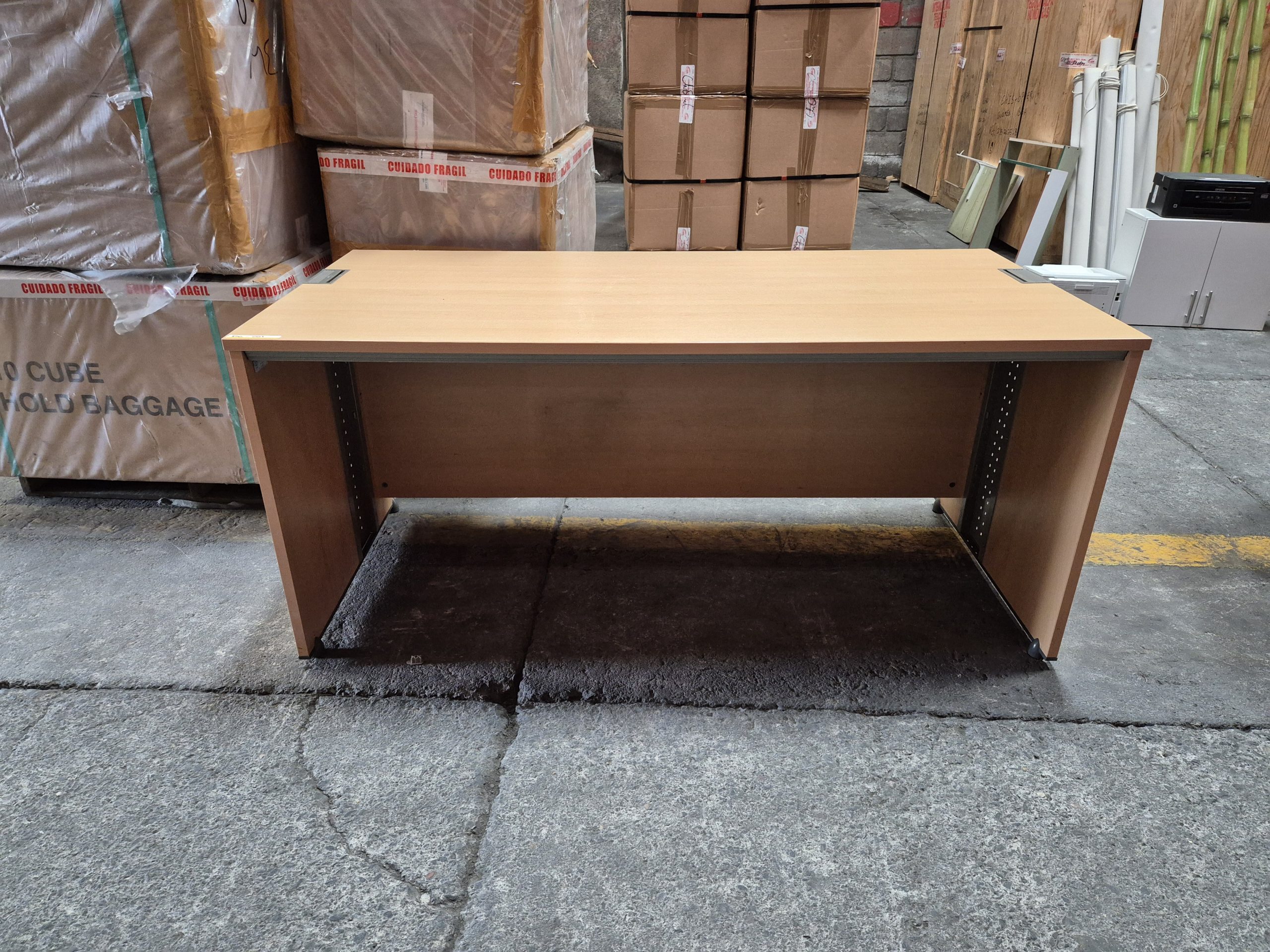 ESCRITORIO DE FIBRAN COLOR CEREZO CLARO CON SOPORTE METAL GRIS