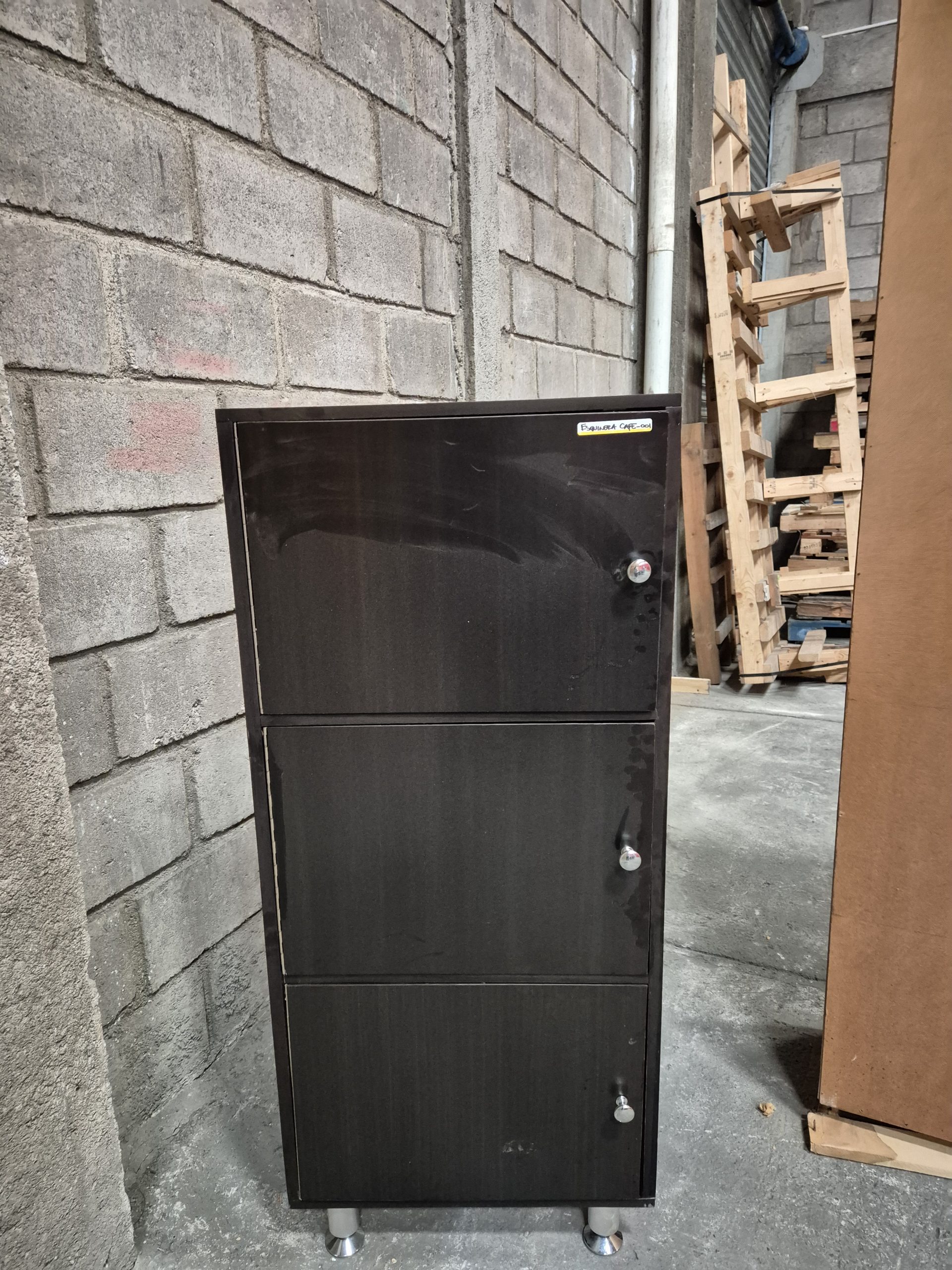 Mueble de esquina de metal color café de 3 puertas y llamadores cromados