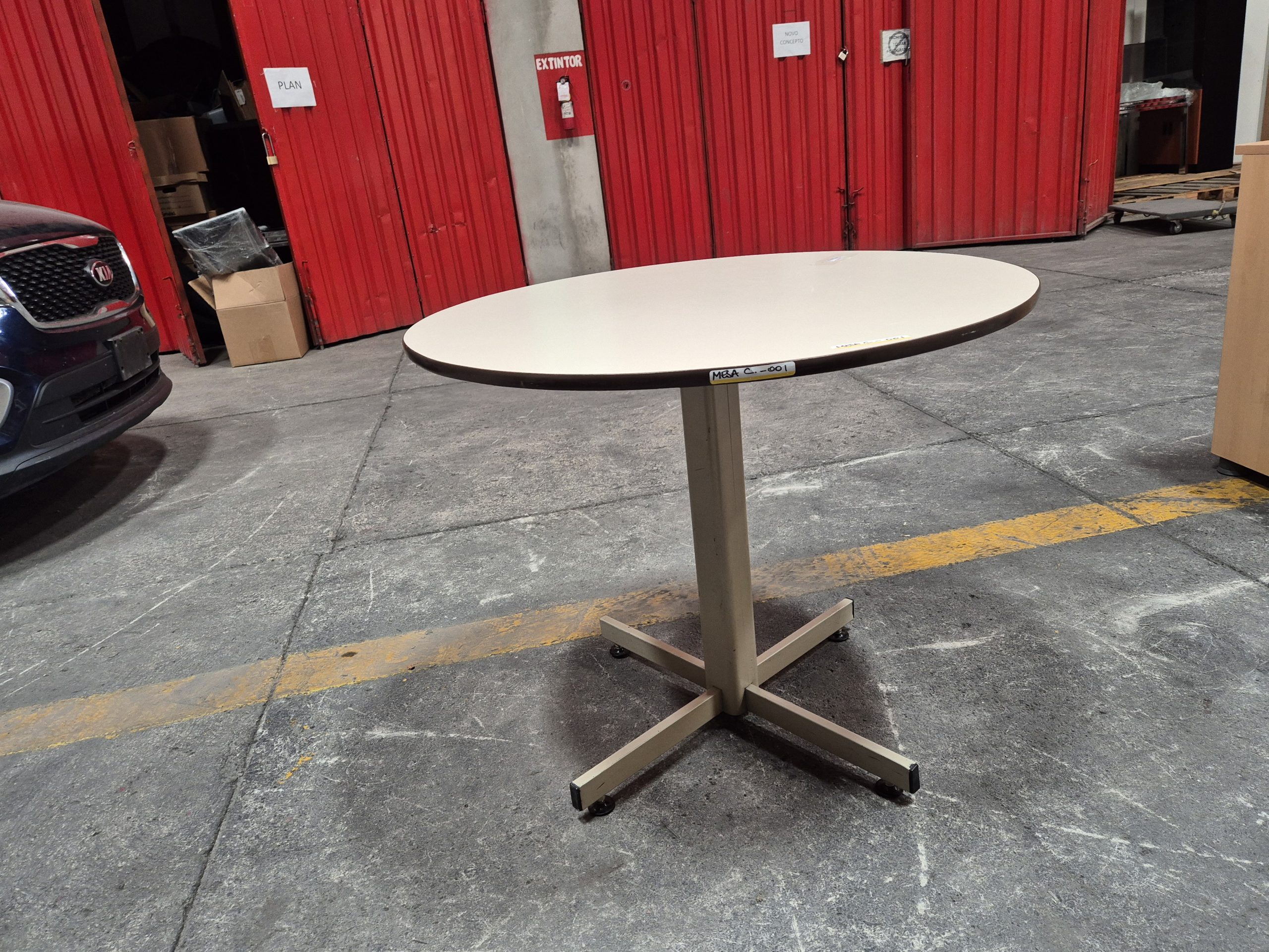 Mesa circular con estructura de metal y superficie en fibran color marfil
